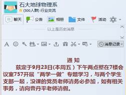 一是建立多信息化基层党建平台(微信群、QQ群、基层单位网站等),在地球物理系网站开辟党支部工作专栏,线上平台与实体活动相结合,实现政治理论学习方式的多元化,方便基层党员,提高工作效能。