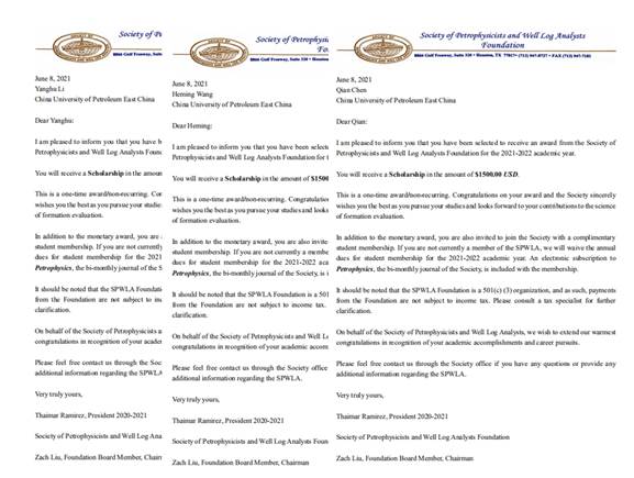 近日,SPWLA(国际岩石物理学家与测井分析家协会)学生奖学金评选结果出炉,beat365官网测井系博士研究生李杨虎、王鹤鸣、陈前3人喜获2021年度SPWLA学生奖学金,奖金为每人1500美元,指导老师为唐晓明教授和张锋教授。据悉,SPWLA奖学金评审委员会每年对来自全球范围的高等院校和科研院所申请者提交的奖学金申请材料进行严格评审,遴选出在测井方法、岩石物理和储层评价等领域取得杰出成果的学生进行奖励。SPWLA奖学金是学生在测井领域获得的国际最高荣誉,标志着beat365官网研究生培养成效获得国际学术界和工业界的认可。