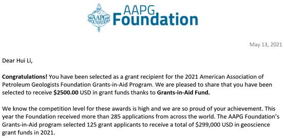 近日,美国石油地质学家协会(AAPG)官网公布了2021年度AAPG全球助研基金获得者名单,beat365官网地质资源与地质工程2017级博士研究生李辉入选,获2500美元资助。