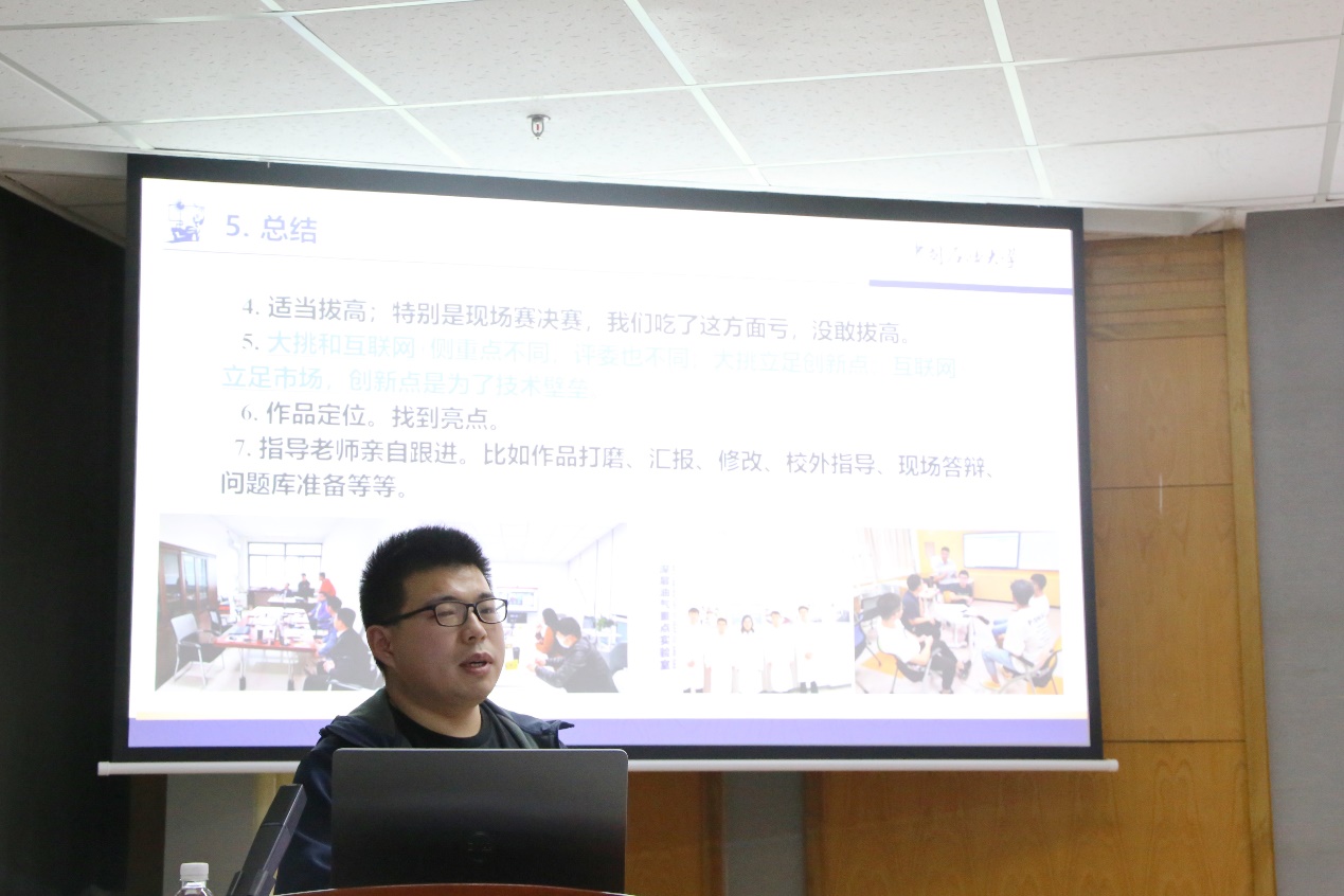 第十七届“挑战杯”全国大学生课外学术科技作品竞赛获奖团队指导教师王振杰、曲英铭分享了大赛指导经验,王振杰表示“三大赛”项目选题要立足国家重大需求,依托优势学科资源,开展有实用价值和推广前景的科研实践工作;指导学生团队解决实际应用中的问题,在科研和备赛的过程中提高自身能力,磨炼意志品质。曲英铭从队伍组建、参赛作品方向选取、作品打磨、答辩备战等维度进行了分享,他表示,比赛可以培养敢闯的素质、会创的本领、家国的情怀,使学生既乐在其中也收获成长。