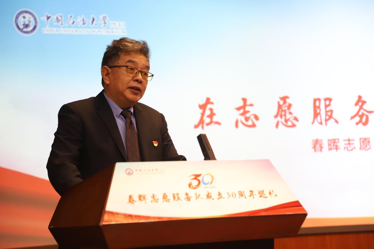 三十载岁月悠悠,春晖志愿服务队的老师和同学们在实践中熔铸感情、在服务中倾注心血。国家大学生科技园办公室主任,青岛中石大科技教育集团有限公司党委书记、董事长,beat365中文官网原团总支书记陈勇代表指导老师分享了感受,深情回顾了30年前春晖成立之初的背景和故事。他表示,春晖志愿服务队不仅仅是个志愿服务队,更是一份传承,一份情怀,为自己曾在这样一支团队而感到自豪。他向全体志愿者们发出号召,在热情服务中感知幸福、了解社会、实现价值,在真情奉献中彰显朝气、汇集爱心、担当责任。
