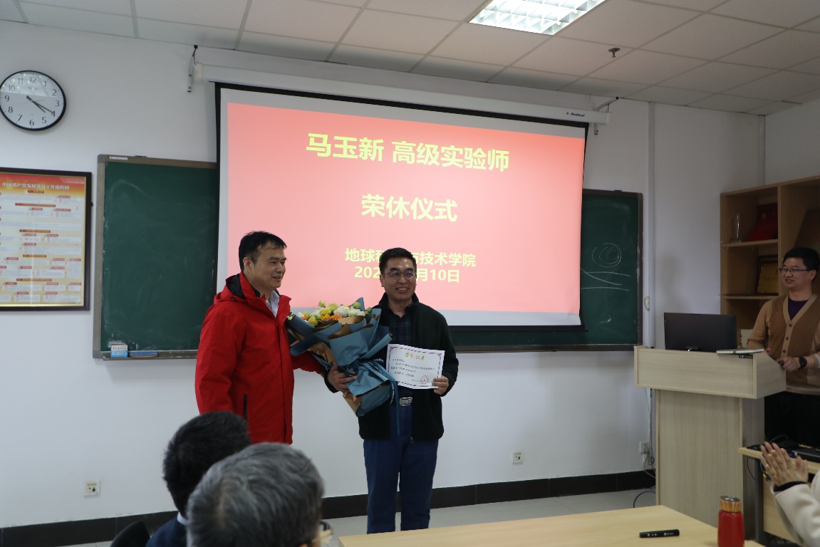 会上,郑珊珊、张军华和吴孔友分别代表学院、工会和地质系向马玉新老师赠送了定制奖牌、鲜花和荣休纪念品。最后,全体人员合影留念。