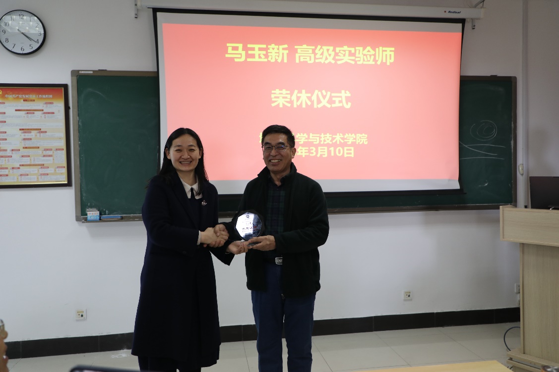 学院党委副书记郑珊珊向马玉新老师颁发荣休奖牌