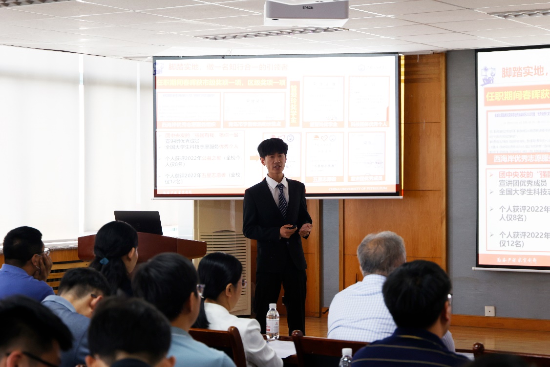 各候选人按抽签顺序依次上台答辩。SCI一区TOP期刊文章、人民网上发表的稿件、6门课程卷面成绩满分……院长奖候选人向大家分享着青春奋斗的累累硕果。博士生王惠君聚焦非常规油气资源的高效勘探开发,发展了高精度储层参数预测技术,有效地利用无标签数据,为建立准确的地质模型提供了依据。2019级本科生孙清在学生工作、社会实践中传播温暖力量,组织30余场活动,全心全意为同学服务;现在她已加入研究生支教团,立志点亮山区孩童的梦想之灯。2020级本科生王建侨连续三年开展志愿服务,他主动帮扶自闭症患者,多次进行支教工作,担任志愿服务宣讲团负责人,用实际行动践行新时代志愿者精神。2021级本科生谷佳莹学习刻苦,追求卓越,学分绩达到97分,担任学习委员,主动帮助身边同学;全国大学生数学竞赛二等奖、中文核心期刊论文是她精勤求学、敦笃励志的结果。地物2002团支部坚持“思想引领铸魂、组织建设聚力、学风建设固基、社会实践励行”的特色发展思路,形成“先进带后进,后进更上进”的良好氛围,相关工作获学习强国、中国青年网等媒体报道。
