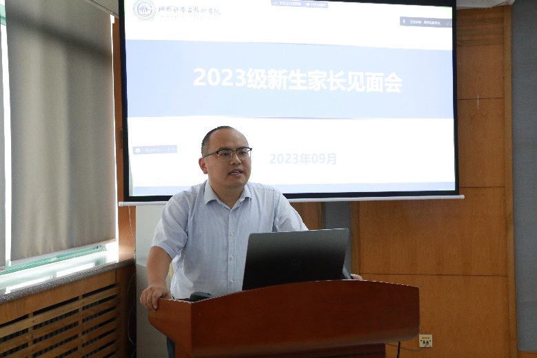 副院长王健教授从地球科学的基本概念引入,通过大量生动的实例介绍学院的四个国家级一流专业,并以“顶天”和“立地”讲述学生未来广阔的发展前景,凸显学院学科教育和人才培养体系的优势所在。王健向新生家长详细介绍了学院“本研一体班”相关政策,他表示,“本研一体班”是打通基础课程,重构课程体系,贯通式培养高层次创新人才的特色培养模式,通过实行动态管理和分流制度保障人才培养的有效衔接。希望全体新生在学院“大师”“大团队”“大平台”的助力支持下,努力成长为可堪大任的时代新人。