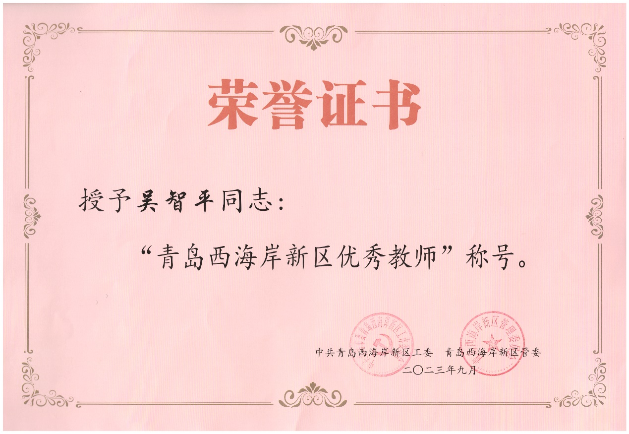近日,西海岸新区2023年度“优秀教师”“优秀教育工作者”入选名单公布,来自西海岸新区13所高校的20名教师获评“优秀教师”荣誉称号,来自10所高校的10名教师获评“优秀教育工作者”荣誉称号。beat365官网吴智平教授获评“青岛西海岸新区优秀教师”荣誉称号。