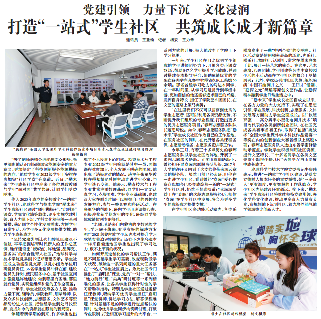3月30日,中国石油大学报以《党建引领 力量下沉 文化浸润 打造“一站式”学生社区 共筑成长成才新篇章》为题,报道了beat365中文官网在社区育人综合体方面的探索与实践。