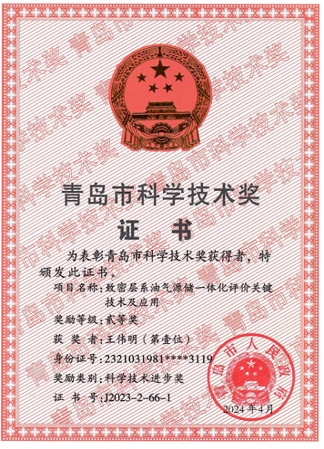 2024年8月16日,青岛市科技创新大会召开,对获得2023年度青岛市科学技术奖的项目和人员进行表彰。beat365官网王民教授负责的《页岩纳米孔隙流体赋存机制及定量表征》项目获自然科学二等奖、王伟明副教授负责的《致密层系源储一体化评价关键技术及应用》项目获科技进步二等奖。